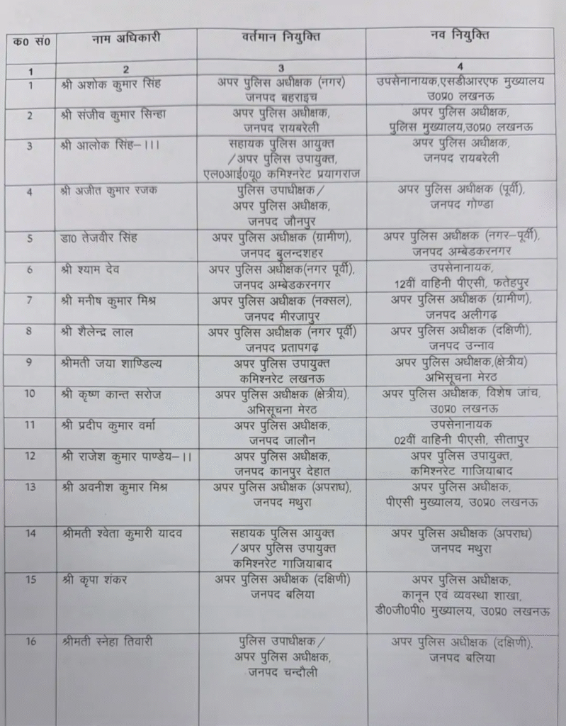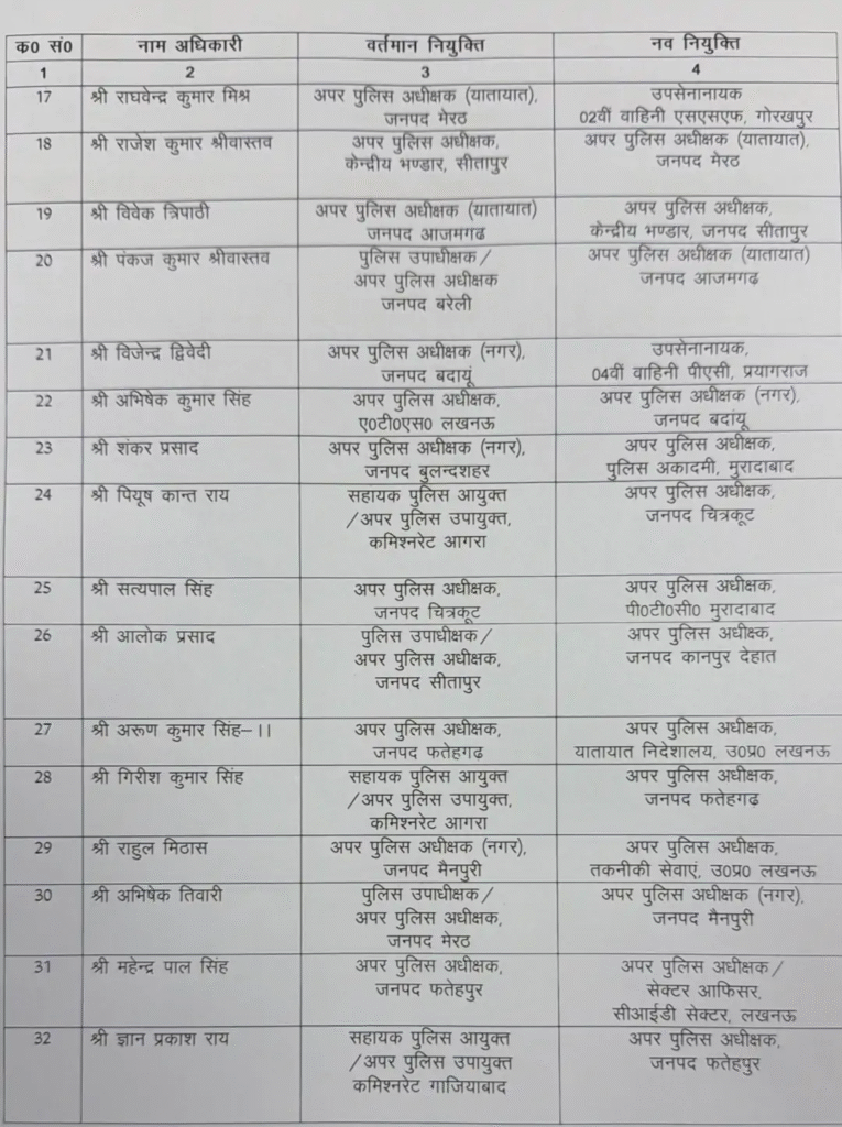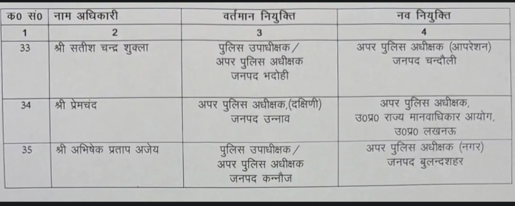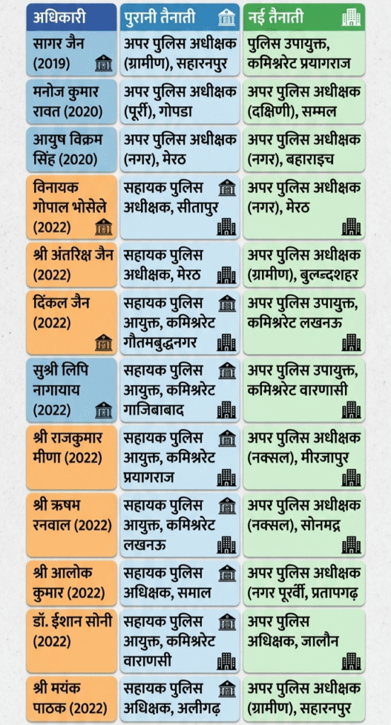 इसी क्रम में राजकुमार मीणा को सहायक पुलिस आयुक्त प्रयागराज से अपर पुलिस अधीक्षक (नक्सल) मिर्जापुर, ऋषभ रूणवाल को सहायक पुलिस आयुक्त लखनऊ से अपर पुलिस अधीक्षक (नक्सल) सोनभद्र, आलोक कुमार को सहायक पुलिस अधीक्षक संभल से अपर पुलिस अधीक्षक (नगर पूर्वी) प्रतापगढ़, डॉ. ईशान सोनी को सहायक पुलिस आयुक्त वाराणसी से अपर पुलिस अधीक्षक जालौन तथा मयंक पाठक को सहायक पुलिस अधीक्षक अलीगढ़ से अपर पुलिस अधीक्षक (ग्रामीण) सहारनपुर तैनात किया गया है।
