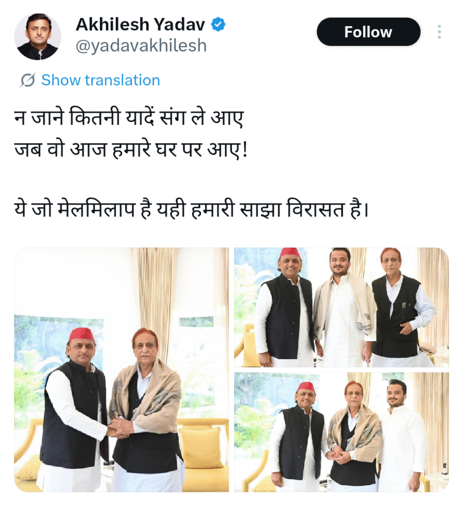 अखिलेश यादव ने इस मुलाकात की तस्वीरें सोशल मीडिया प्लेटफॉर्म X (पूर्व में ट्विटर) पर साझा करते हुए लिखा—
