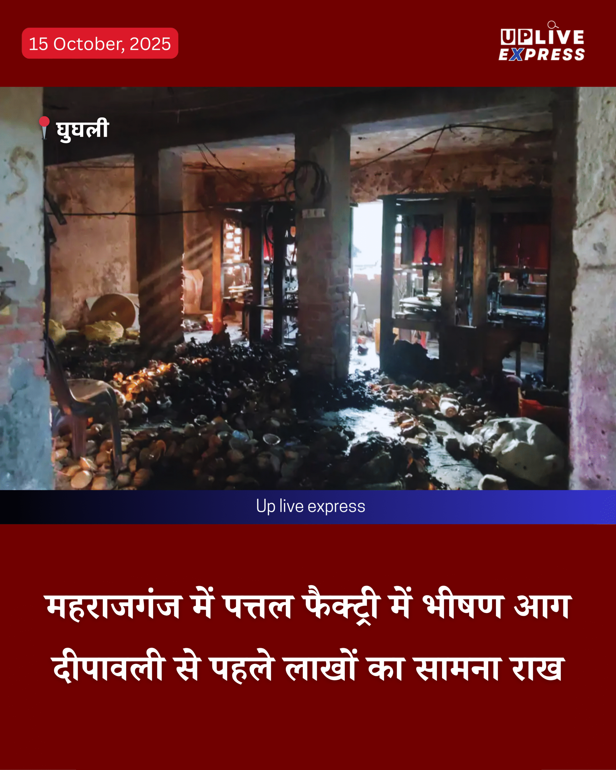 महराजगंज। घुघली थाना क्षेत्र के बेलवा टिकर गांव में मंगलवार दोपहर उस वक्त हड़कंप मच गया जब एक पत्तल फैक्ट्री में भीषण आग भड़क उठी। बताया जा रहा है कि उदय एंटरप्राइजेज नामक यह फैक्ट्री कागज की पत्तल और दोना बनाने का काम करती थी, जिसमें शॉर्ट सर्किट के चलते अचानक आग लग गई। हादसा दीपावली से ठीक पहले हुआ, जिससे लाखों रुपये का सामान जलकर खाक हो गया।