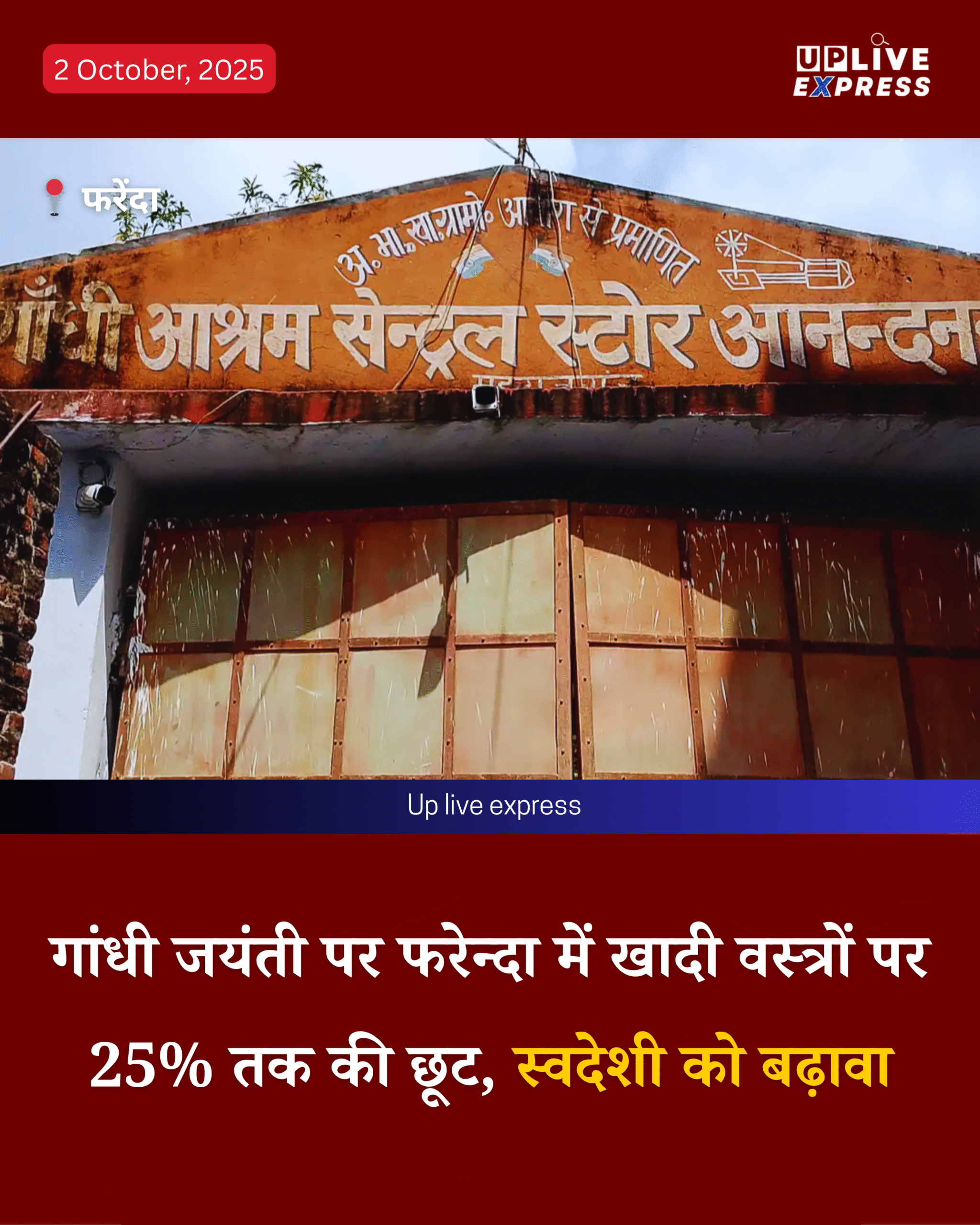 महराजगंज, फरेन्दा। महात्मा गांधी की जयंती के अवसर पर 2 अक्टूबर से खादी वस्त्रों पर 25% तक की विशेष छूट की घोषणा की गई है, यह छूट फरेन्दा सेटल स्टोर सहित कई स्थानों पर उपलब्ध होगी, जिससे अधिक से अधिक लोग खादी और स्वदेशी उत्पादों को अपनाने के लिए प्रेरित होंगे।