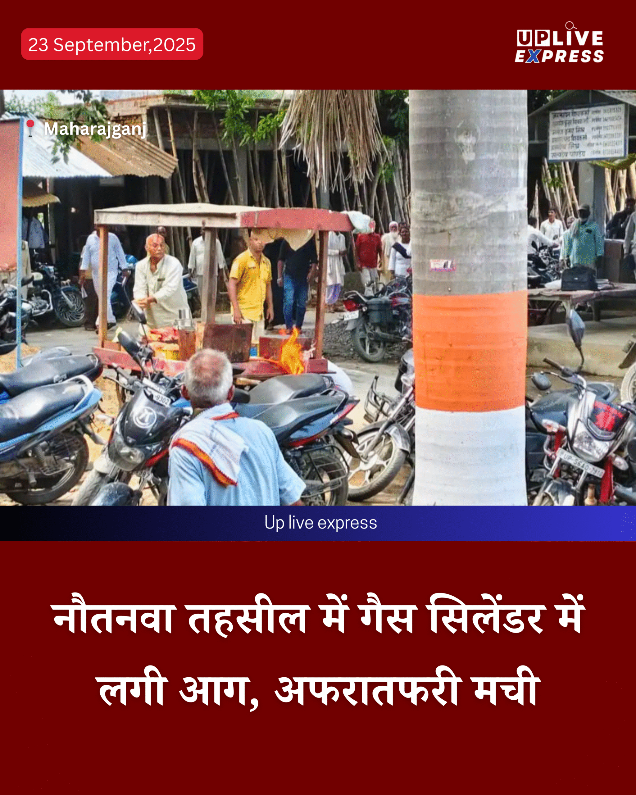 महराजगंज के नौतनवा तहसील परिसर में सोमवार को अचानक डरावनी घटना हुई, भूजा भुनने वाले के ठेले पर रखे गैस सिलेंडर में आग लग गई।