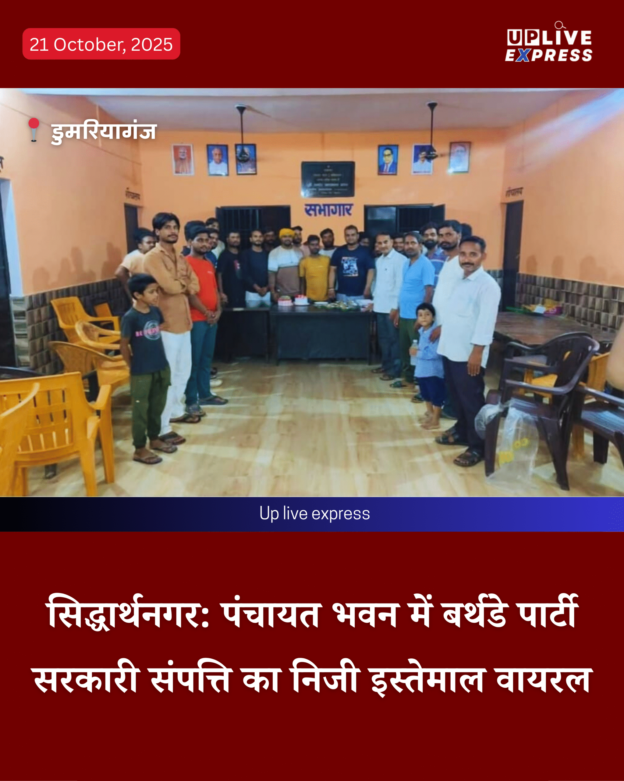 डुमरियागंज/सिद्धार्थनगर जिले के ग्राम पंचायत बयारा में सरकारी पंचायत भवन का निजी उपयोग किया गया। पंचायत भवन को निजी जश्न के लिए इस्तेमाल किया गया, जिसमें बर्थडे पार्टी का आयोजन किया गया और केक काटकर मौज-मस्ती की गई। सोशल मीडिया पर इसका वीडियो तेजी से वायरल हो रहा है।