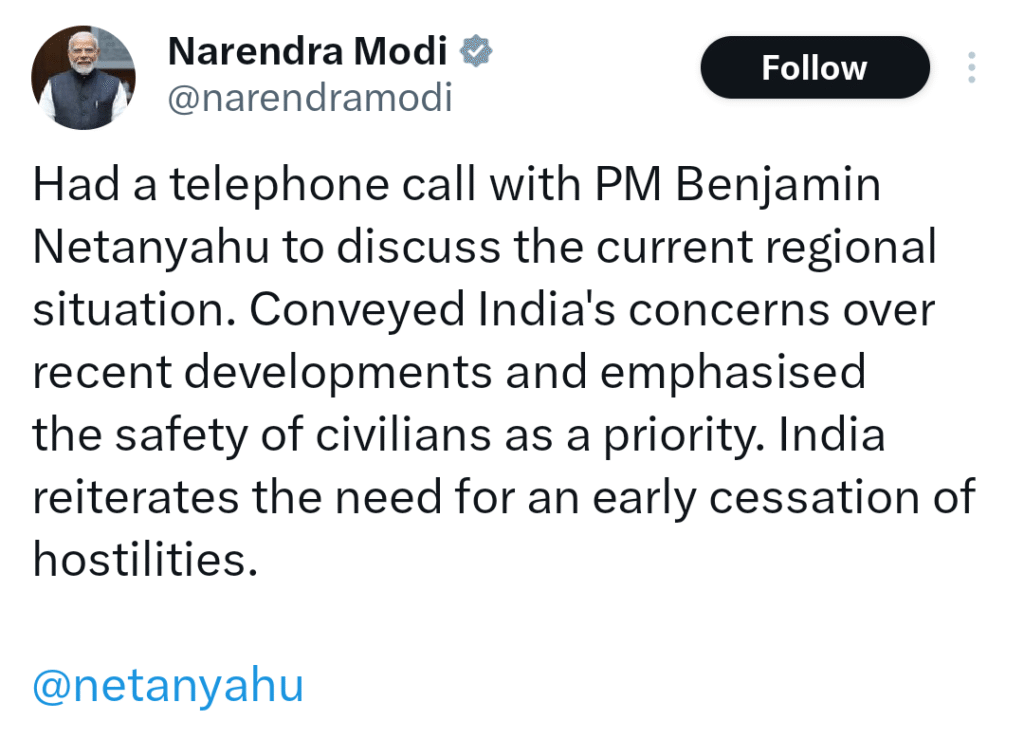 मिडिल ईस्ट में बढ़ते तनाव के बीच नरेंद्र मोदी ने बेंजामिन नेतन्याहू से फोन पर बातचीत की। इस दौरान उन्होंने क्षेत्र में जल्द से जल्द संघर्ष विराम की आवश्यकता पर जोर दिया।