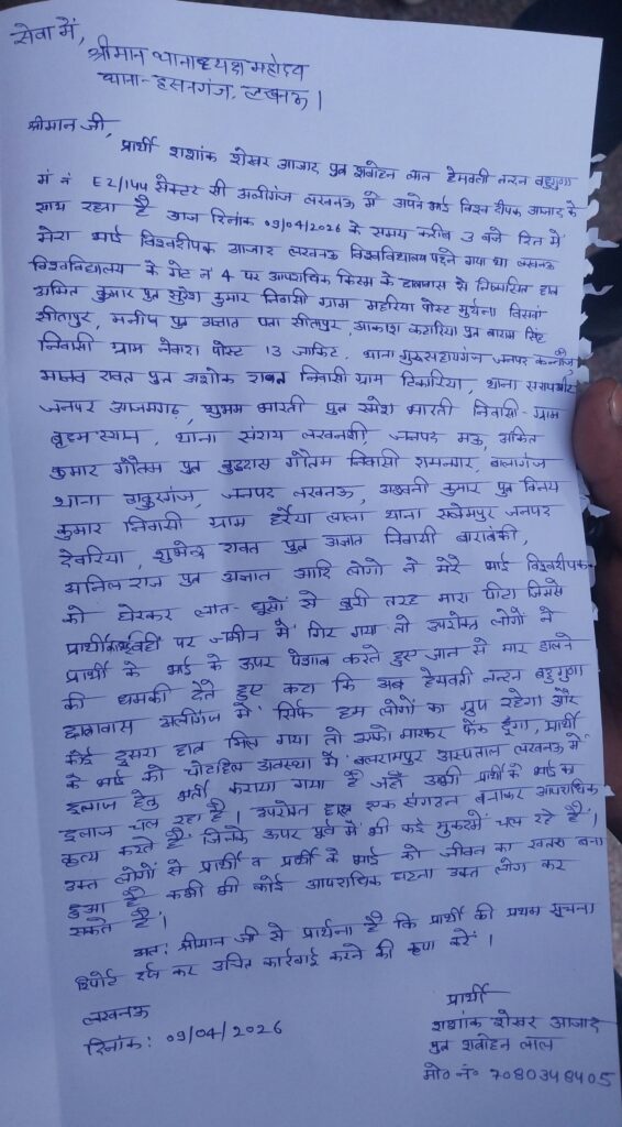 मामले को लेकर हसनगंज थाना, लखनऊ में लिखित आवेदन (तहरीर) भी दिया गया है। आवेदन में आरोप लगाया गया है कि नामजद लोगों ने घेरकर लात-घूंसों से हमला किया, जमीन पर गिराकर जान से मारने की धमकी दी और कहा कि छात्रावास में अब सिर्फ उन्हीं लोगों का दबदबा रहेगा।