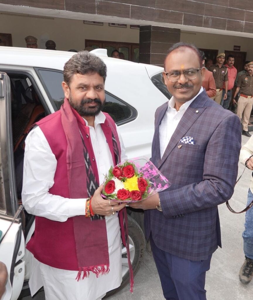 जिलाधिकारी ने मंत्री जी को पुष्पगुच्छ भेंट कर स्वागत किया