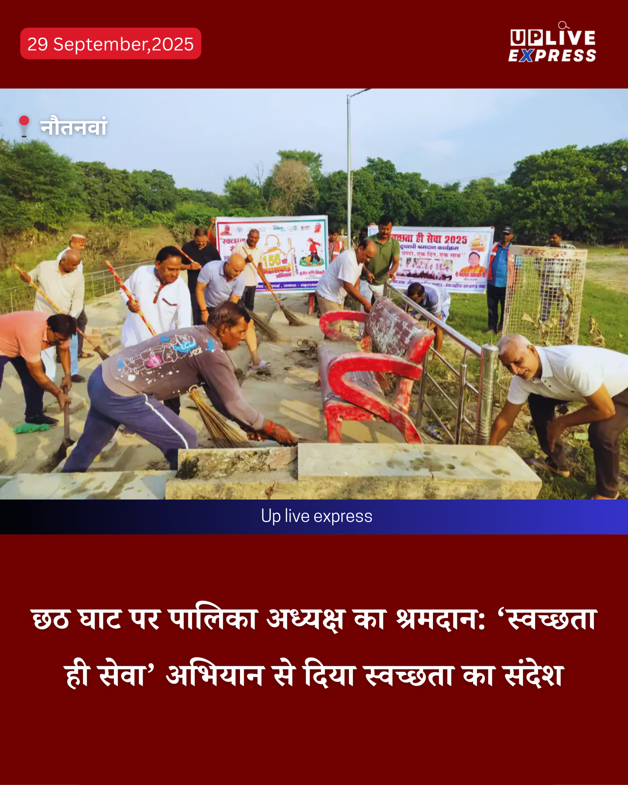 नौतनवा। ‘स्वच्छता ही सेवा’ पखवाड़े के तहत नगर पालिका अध्यक्ष बृजेश मणि त्रिपाठी और योगा परिवार नौतनवा ने दोमुहान स्थित छठ घाट पर एक घंटे का श्रमदान किया, यह अभियान ‘एक घंटा, एक दिन, एक साथ’ कार्यक्रम का हिस्सा रहा।