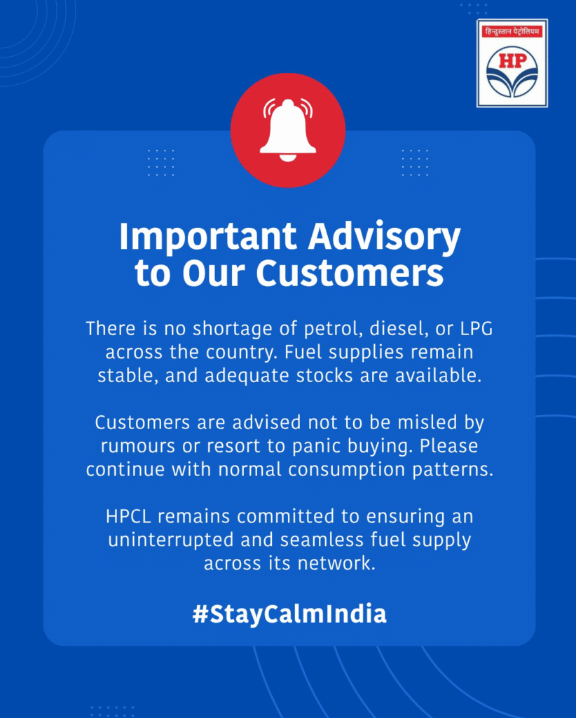 HPCL ने एडवाइजरी जारी किया, अफवाहों पर ध्यान न देने के निर्देश