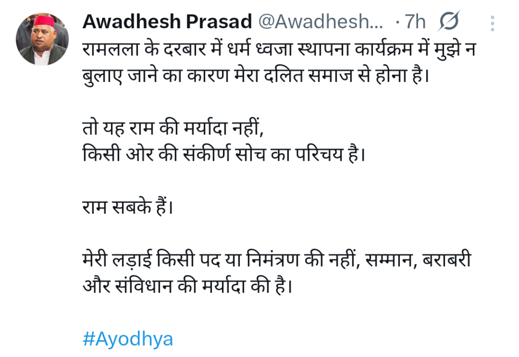 राम मंदिर ध्वजारोहण समारोह- सपा सांसद अवधेश प्रसाद ने निमंत्रण न मिलने पर जताई नाराज़गी: