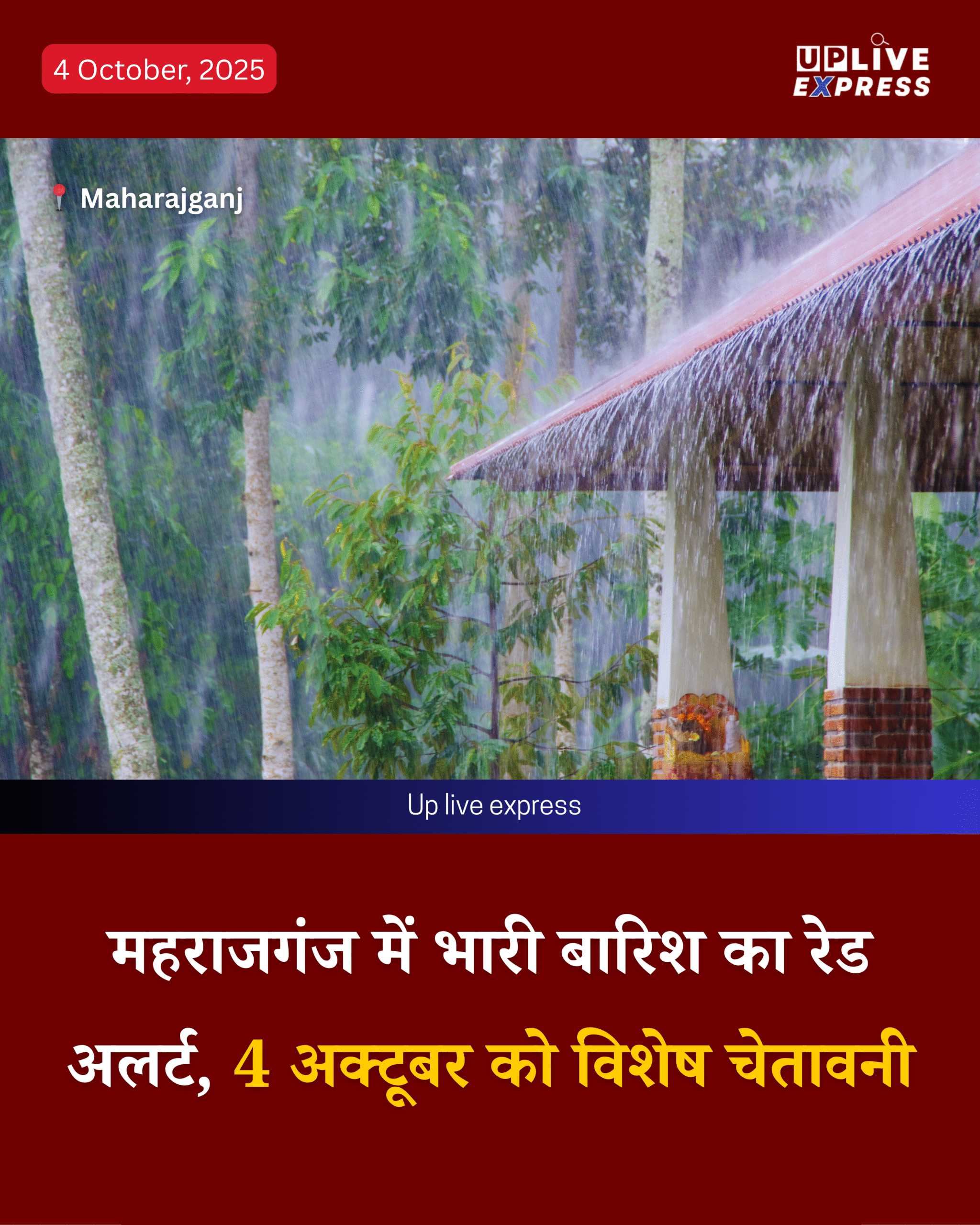 महराजगंज में मौसम विज्ञान विभाग ने 4 अक्टूबर 2025 के लिए भारी बारिश का रेड अलर्ट जारी किया है। विभाग का कहना है कि 2 से 5 अक्टूबर तक लगातार बारिश की संभावना बनी हुई है। इससे जलभराव और नदियों के जलस्तर में खतरनाक बढ़ोतरी की आशंका जताई जा रही है।