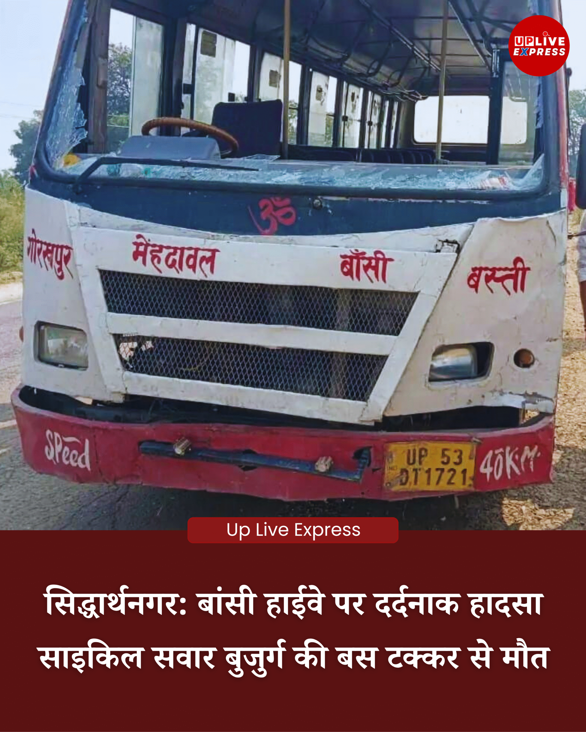 बांसी, सिद्धार्थनगर / गोरखपुर-बांसी मार्ग पर दर्दनाक हादसा, अनुबंधित सवारी बस UP53 DT 1721 के अगले टायर फटने के कारण 65 वर्षीय भूसौला निवासी लाल बचन मिश्र पुत्र रामबरन मिश्र, जो साइकिल चला रहे थे, को जोरदार टक्कर लग गई।