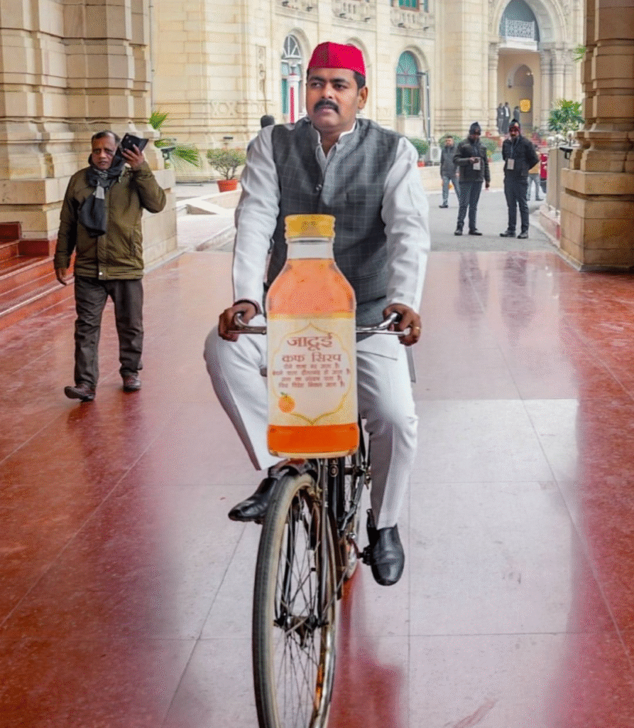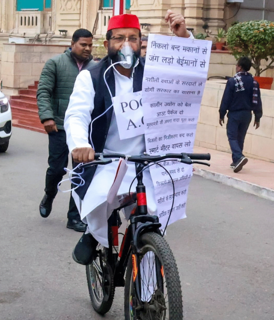 लखनऊ। उत्तर प्रदेश विधानसभा के शीतकालीन सत्र के पहले दिन समाजवादी पार्टी (सपा) के विधायकों ने कफ सिरप तस्करी और वायु प्रदूषण (AQI) के मुद्दे को लेकर अनोखे तरीके से विरोध प्रदर्शन किया, सत्र शुरू होने से पहले सपा विधायक अलग-अलग प्रतीकों के साथ विधानसभा परिसर पहुंचे और सरकार पर गंभीर आरोप लगाए।