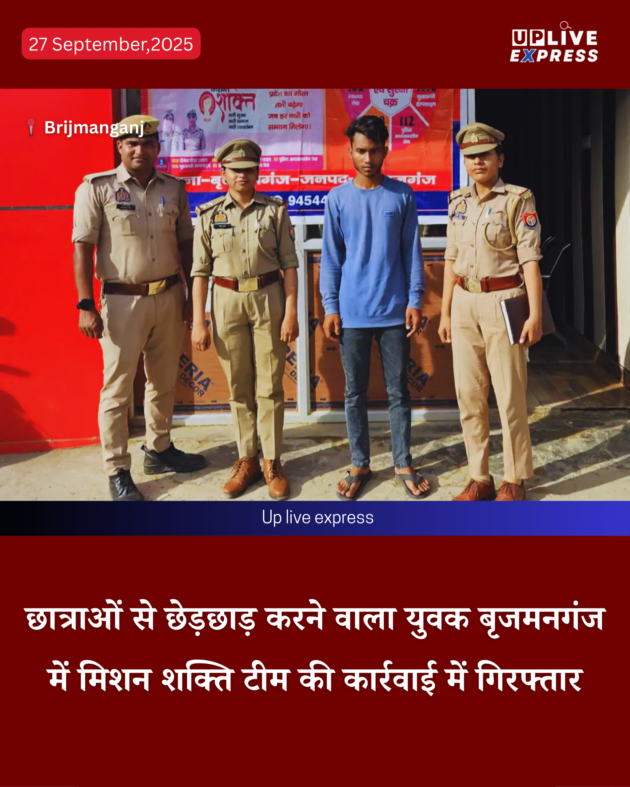 बृजमनगंज: मिशन शक्ति टीम ने स्कूल जा रही छात्राओं से छेड़छाड़ करने वाले एक युवक को गिरफ्तार कर न्याय दिलाने की दिशा में महत्वपूर्ण कदम उठाया है, यह घटना शनिवार को थाना क्षेत्र के हरनामपुर चौराहे पर हुई।