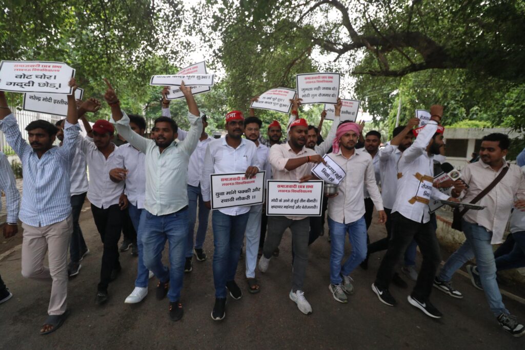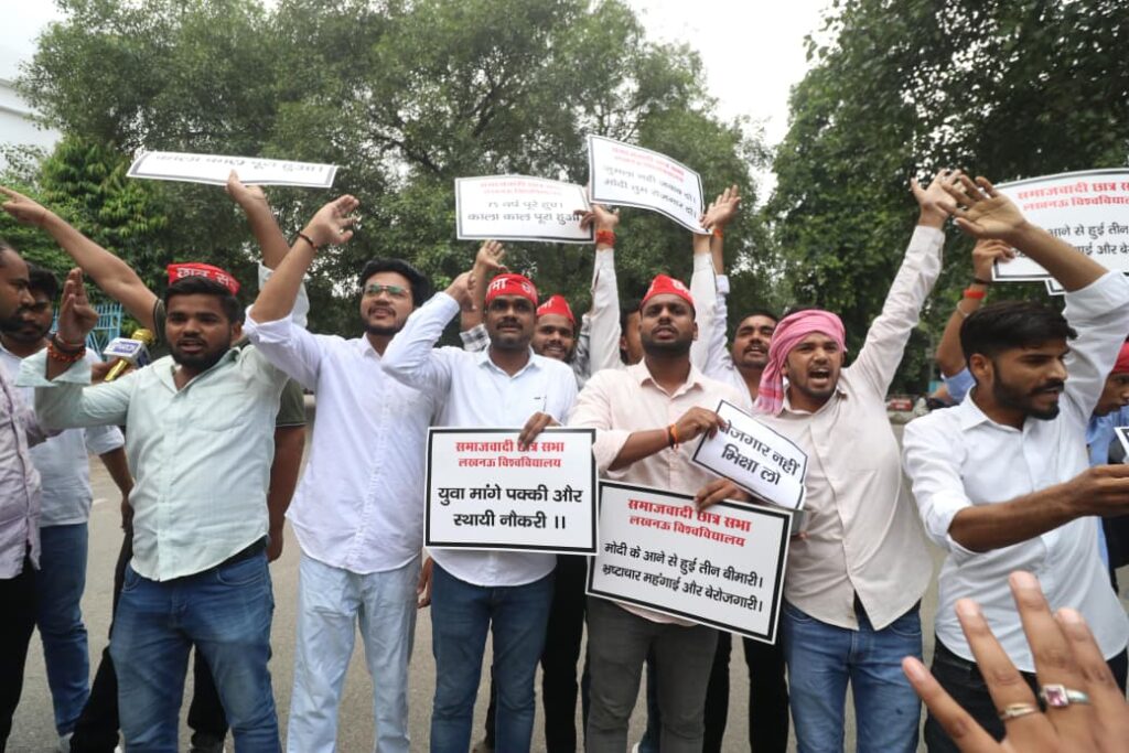 आज समाजवादी छात्र सभा लखनऊ विश्वविद्यालय इकाई ने भारत के प्रधानमंत्री के जन्मदिवस को राष्ट्रीय बेरोजगार दिवस के रूप में मनाते हुए जोरदार विरोध प्रदर्शन किया।