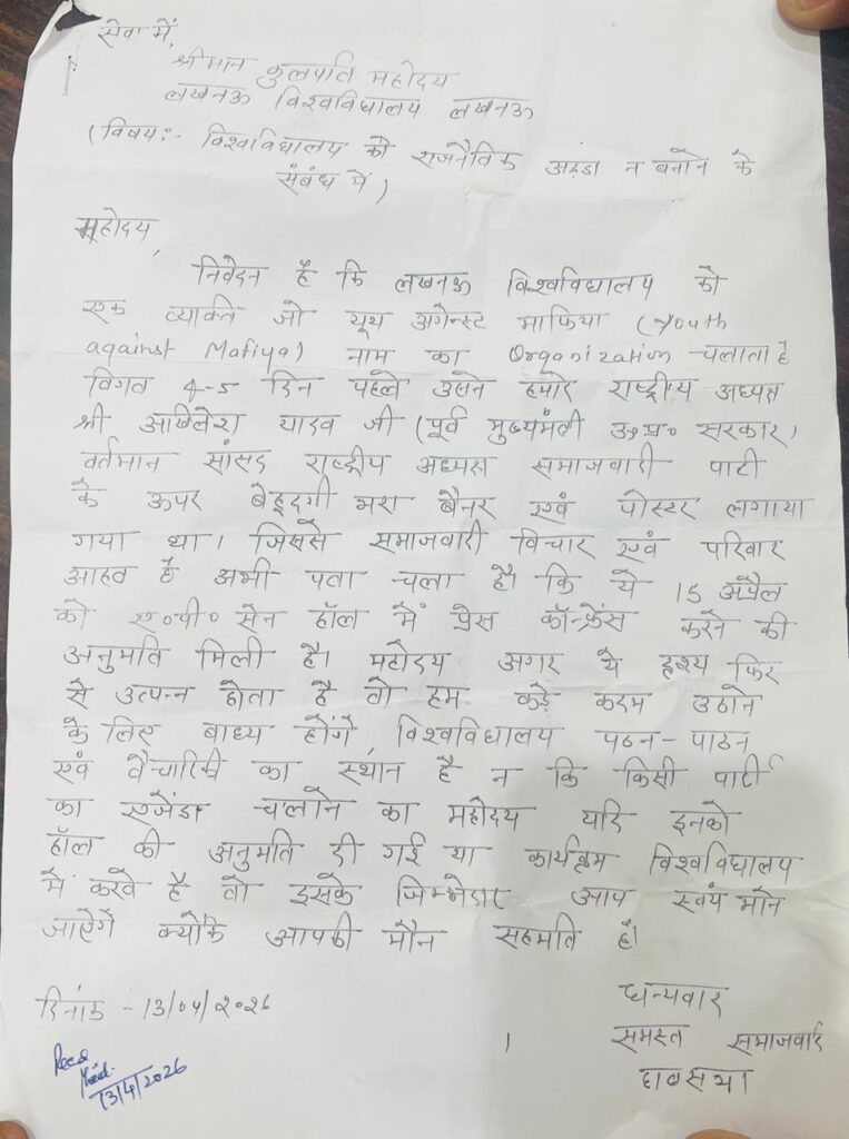 लखनऊ विश्वविद्यालय को एक व्यक्ति जो यूथ अगेन्स्ट माफिया (Youth against Mafiya) नाम का Organization चलाता है, विगत 4-5 दिन पहले उसने हमारे राष्ट्रीय अध्यत श्री अखिलेश यादव जी (पूर्व मुख्यमंत्री, वर्तमान सांसद, राष्ट्रीय अध्यक्ष समाजवादी पार्टी) के ऊपर बेहूदगी भरा बैनर एवं पोस्टर लगाया गया था। जिससे समाजवादी विचार एवं परिवार आहत है।