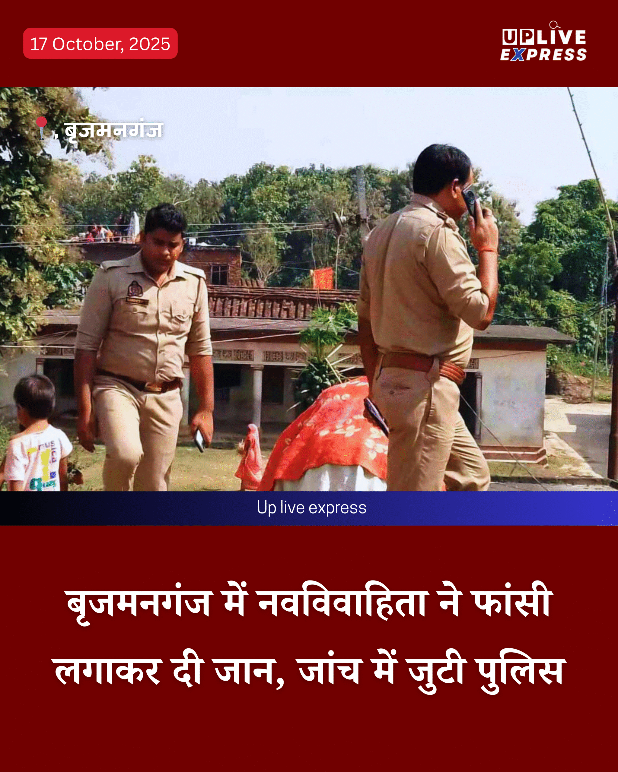 थाना बृजमनगंज क्षेत्र के ग्राम सभा मटिहनवा टोला ओरियापुर में एक 20 वर्षीय नवविवाहिता ने घर में दुपट्टे का फंदा लगाकर आत्महत्या कर ली, मृतका की पहचान रीत, पत्नी आकाश यादव के रूप में हुई है, जिसका विवाह इस वर्ष 5 मई 2025 को हुआ था।